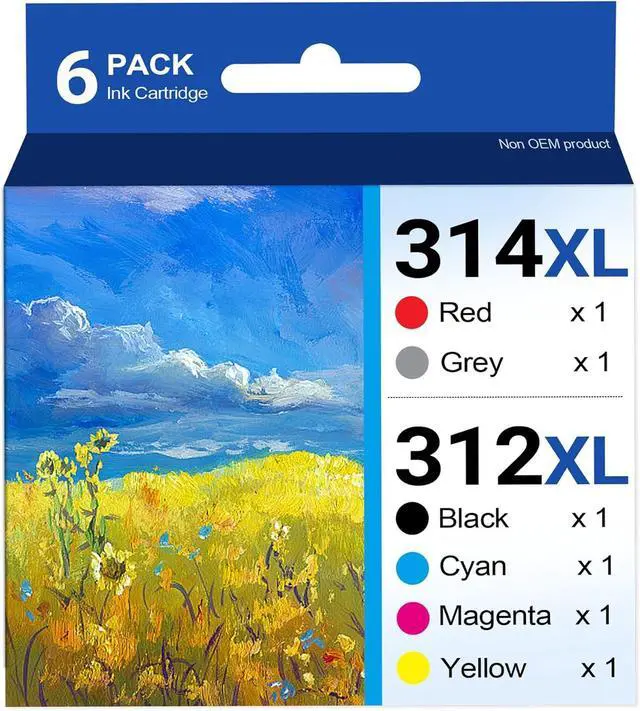 In this Package: 6 Pack 312XL 314XL Ink Cartridges set includes 1 x 312XL Black ink cartridge,1 x 312XL Cyan ink cartridge,1 x 312XL Magenta ink cartridge,1 x 312XL Yellow ink cartridge,1 x 314XL red ink cartridge,1 x 314XL grey ink cartridge
