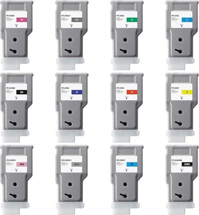 Includes: Cyan, Photo Cyan, Magenta, Photo Magenta, Yellow, Black, Matte Black, Red, Green, Blue, Gray, and Photo Gray Ink Tanks | PFI-206C PFI-206PC PFI-206M PFI-206PM PFI-206Y PFI-206BK PFI-206MBK PFI-206R PFI-206G PFI-206B PFI-206GY PFI-206PGY