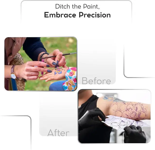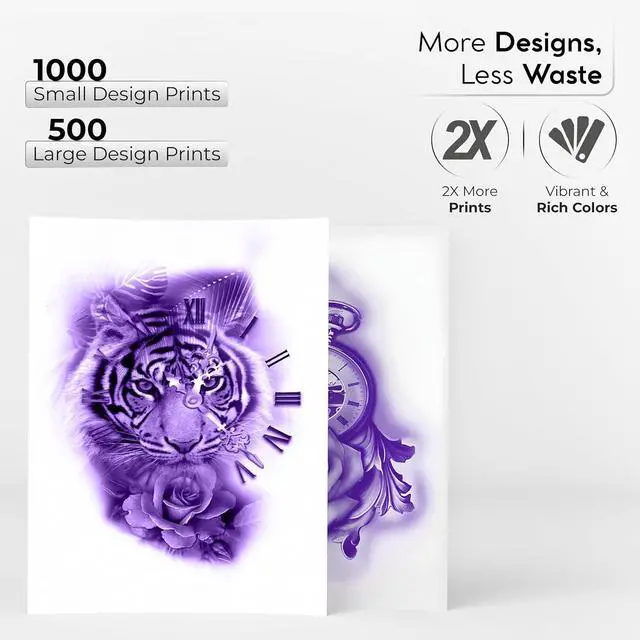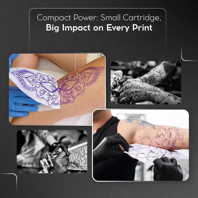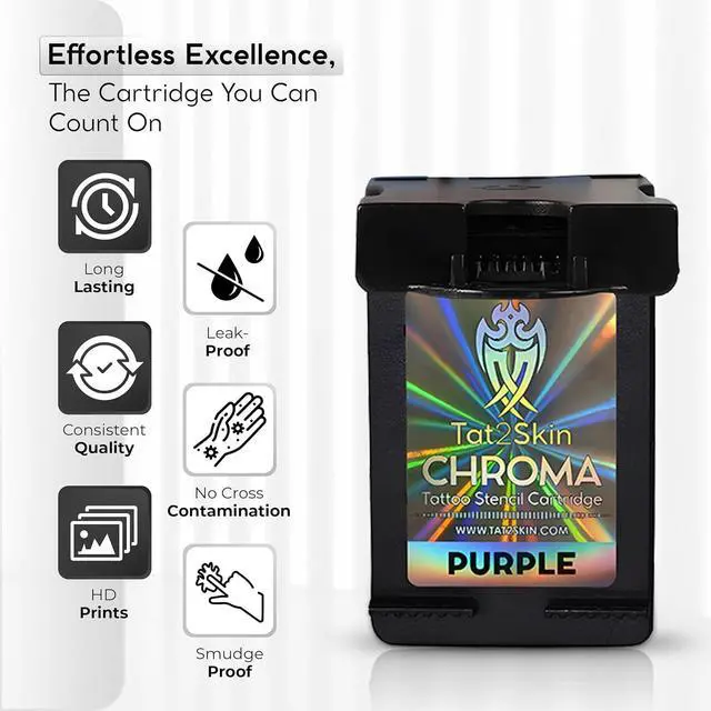 FLAWLESS STENCILS WITH CHROMA INK CARTRIDGE : Achieve flawless tattoo stencils effortlessly with Tat2Skin's Chroma. Just connect your printer with our Chroma cartridge and print high-definition stencils with perfect accuracy, eliminating human error. Elevate your tattoo game now.
