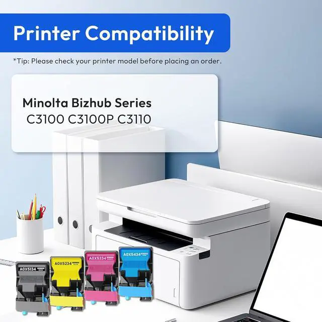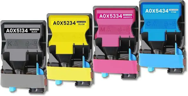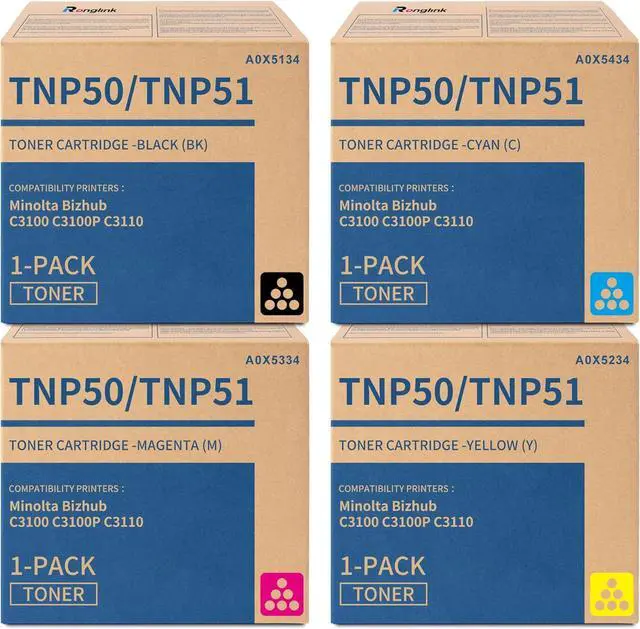 Package includes: 1 x A0X5134 black toner cartridge, 1 x A0X5434 cyan toner cartridge, 1 x A0X5334 magenta toner cartridge, 1 x A0X5234 yellow toner cartridge replacement for Konica TNP50 toner cartridge, TNP-50 toner cartridge, TNP51 toner cartridge, TNP-51 toner cartridge.