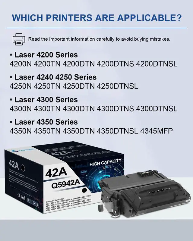 42A Toner Compatible for: Laser 4200 4240 4250 4300 4350 Series 4200N 4200TN 4200DTN 4200DTNS 4200DTNSL 4250N 4250TN 4250DTN 4250DTNSL 4300N 4300TN 4300DTN 4300DTNS 4300DTNSL 4350N 4350TN 4350DTN 4350DTNSL 4345MFP Printers