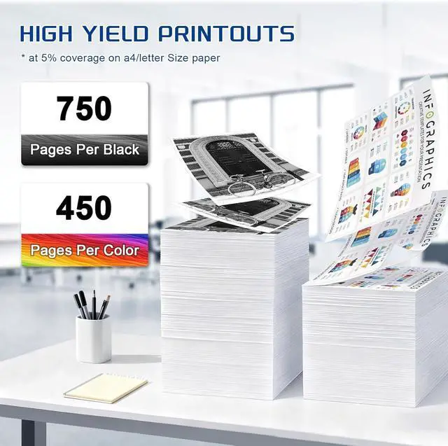 High-Page-Yield Ink Cartridges: Get more done without frequent replacements. The 805 805XL black cartridge produces up to 750 pages pages, and each color cartridge (cyan, magenta, yellow) yields up to 450 pages pages, using A4 paper at 5% coverage