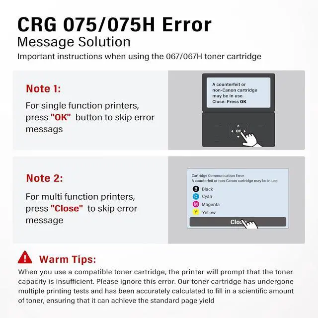 Printer Compatibility: Cartridge 075 toner compatibe for Canon Color imageCLASS MF660 MF660C MF662Cdw MF663Cdw MF665Cdw; LBP640 LBP640C LBP646Cdw LBP647Cdw Series Printer.