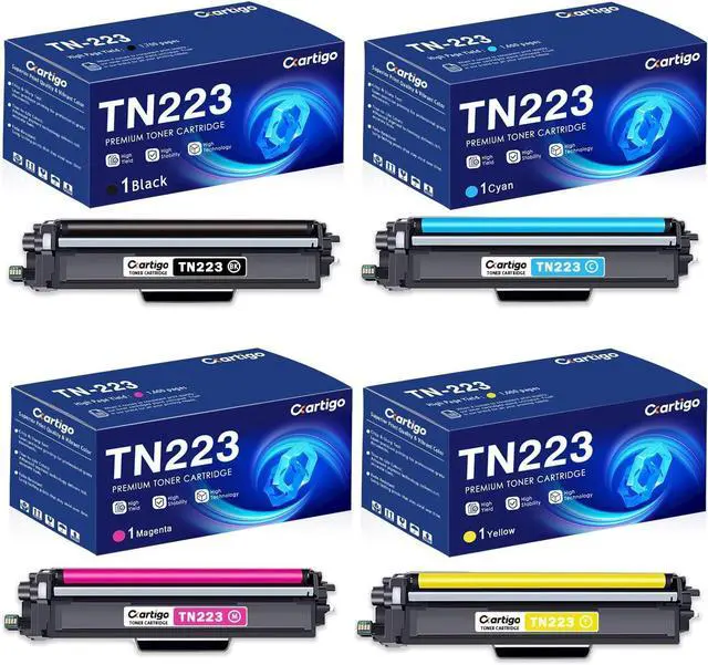 Package Contents: 4 Pack TN223 High Yield toner cartridge Replacement for TN223BK TN223C TN223M TN223Y Toner Cartridge1Black 1Cyan 1Yellow 1Magenta, With Chip