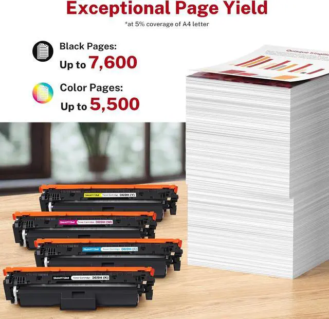 Estimate Cartridge Yield: 069H is the high-capacity version of the 069 Toner Cartridges. Up to 7,600 pages per 069H black toner cartridge and 5,500 pages per 069H color toner cartridge (Letter/A4, at 5% coverage)