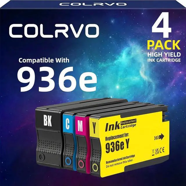 4-Pack 936e Ink Cartridges: 936e ink cartridges combo pack includes 1 black, 1 cyan, 1 magenta, and 1 yellow cartridge, designed as compatible replacements for HP 936 / 936e ink cartridges.