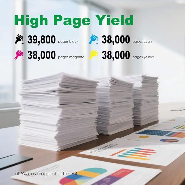 Page Yield:Up to 3,9800 pages per black toner cartridge, 3,8000 pages per color toner cartridgeBased on 5% coverage of Letter/A4.