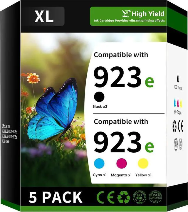 Content Packing: 923e 5 Pack High Yield Color Ink Cartridge Replacement Compatible with HP923e HP923 923 e Ink Cartridge Combo Pack (2 x Black 923e ink, 1 x Cyan 923e ink, 1 x Yellow 923e ink, 1 x Magenta 923e ink)