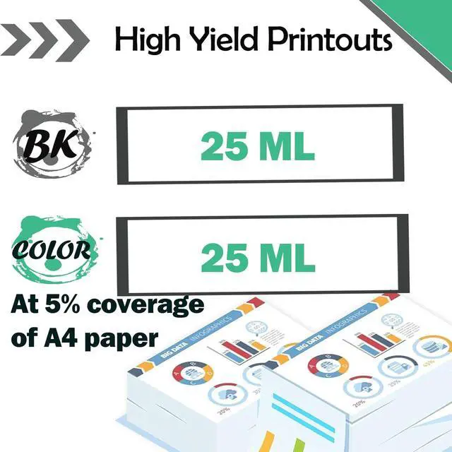 Large Cartridge Capacity: 25 ML per black cartridges, 25 ML per color cartridges (A4 paper at 5% coverage )