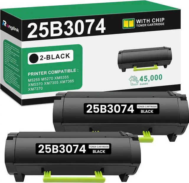 Package includes: 2 x 25B3074 black toner cartridge replacement for Lexmark 25B3074 toner cartridge, M5255 toner cartridge, M5270 toner cartridge.