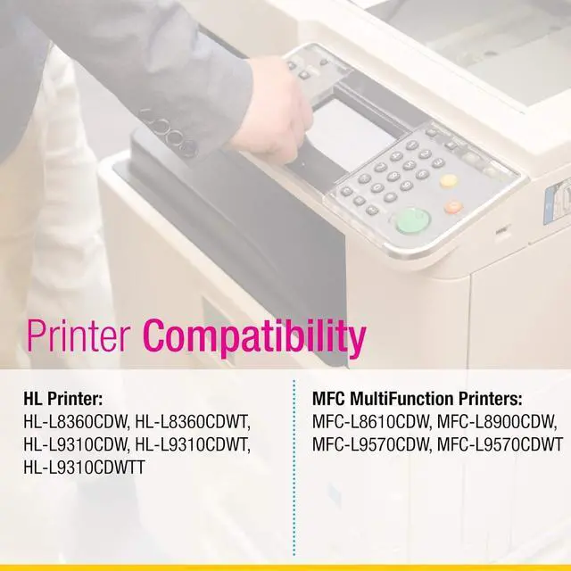 Compatible with Brother Printers: HL Printers HL-L8260CDW, HL-L8360CDW, HL-L8360CDWT, HL-L9310CDW, HL-L9310CDWT, HL-L9310CDWTT, MFC MultiFunction Printers MFC-L8610CDW, MFC-L8900CDW, MFC-L9570CDW, MFC-L9570CDWT