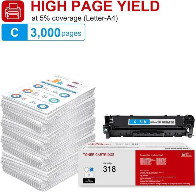Page Yield: 3,000 pages per 318 Cyan Toner Cartridge at 5% coverage.