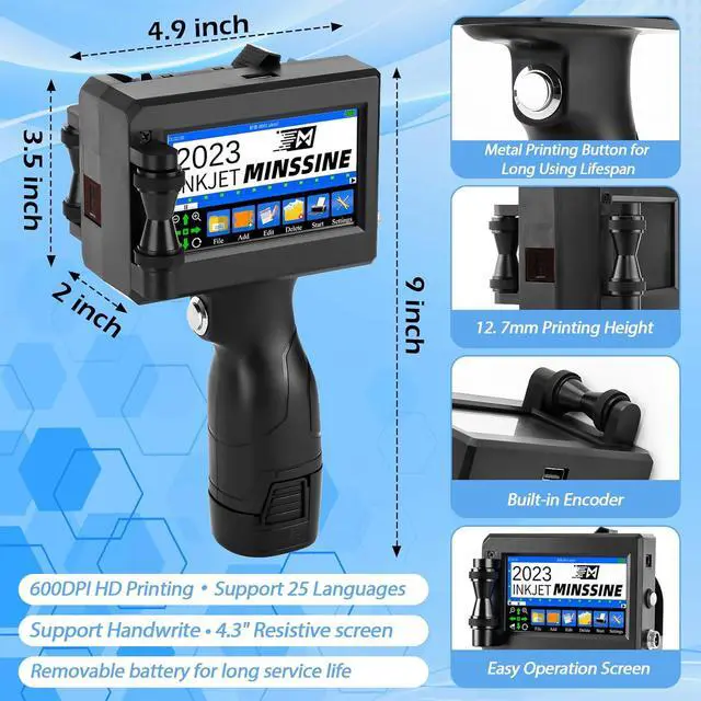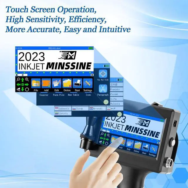 The Minssine portable handheld inkjet printer boasts a 4.3-inch resistive touch screen, ensuring high sensitivity and effortless usability. Equipped with a 42ml quick-drying black solvent ink cartridge, this intelligent handheld printer gun is a game-changer.It adapts seamlessly to diverse surfaces and materials, including but not limited to wood, leather, fabric, bamboo, paper, glass, ceramics, plastic, cardboard, boards, PVC pipes, and aluminum foil.With its capability to print a myriad of content ranging from time, production date, expiration date, batch number, to barcode text, barcodes, graphics, and logos, the Minssine handheld inkjet printer gun is an indispensable tool for enhancing efficiency and productivity in your business operations.
