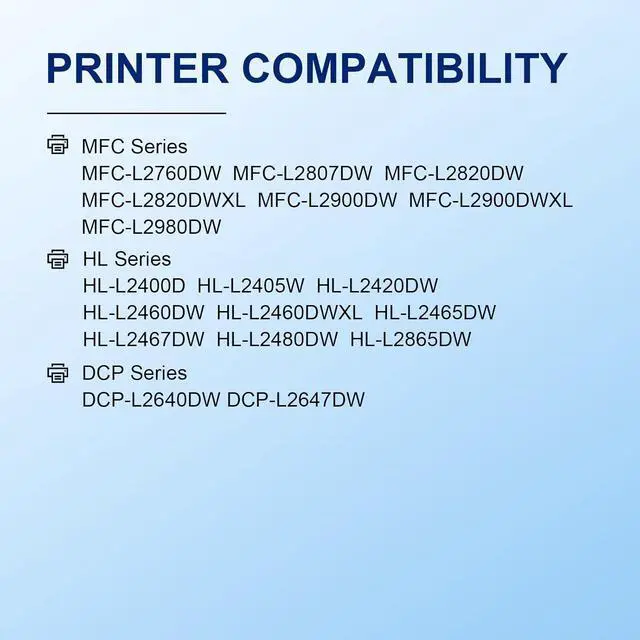 Printer Compatibility: Compatible for Brother HL-L2460DW, HL-L2405W, DCP-L2640DW, HL-L2420DW, HL-L2480DW, HL-L2400D, HL-L2400DW, HL-L2460DWXL, HL-L2465DW, HL-L2467DW, HL-L2865DW, MFC-L2820DW, MFC-L2760DW, MFC-L2807DW, MFC-L2820DWXL, MFC-L2900DW, MFC-L2900DWXL, MFC-L2980DW, DCP-L2647DW toner Printer.