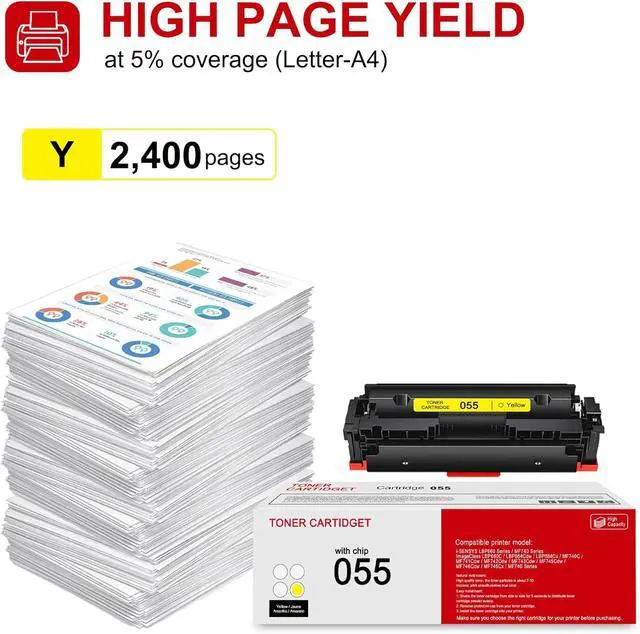 Page Yield: 2,400 pages per CRG-055 Y yellow toner cartridge at 5% coverage.