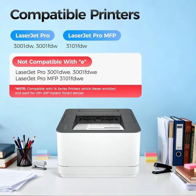 Note: Please check your printer model before ordering.NOT Compatible for Suffix with Letter "e" such as: Pro MFP 3001dwe mfp 3101fdwe mfp 3101fdwe Series Printer.Don't activate and update the compatible for HP+ Program. Program activation will cause the compatible toner cartridge to be unrecognized