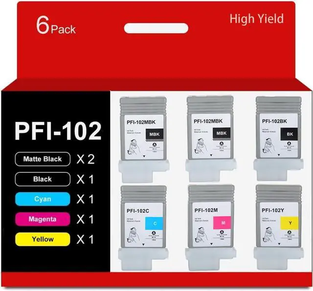 This Item Includes: 6 Pack PFI-102 PFI-102MBK Matte Black x2, PFI-102BK Black x1, PFI-102C Cyan x1,PFI-102M Magenta x1, PFI-102Y Yellow x1