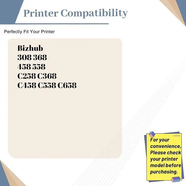Compatible Printer ModelsFor Konica Minolta bizhub 308 368 458 558 C258 C368 C458 C558 C658 Printers.