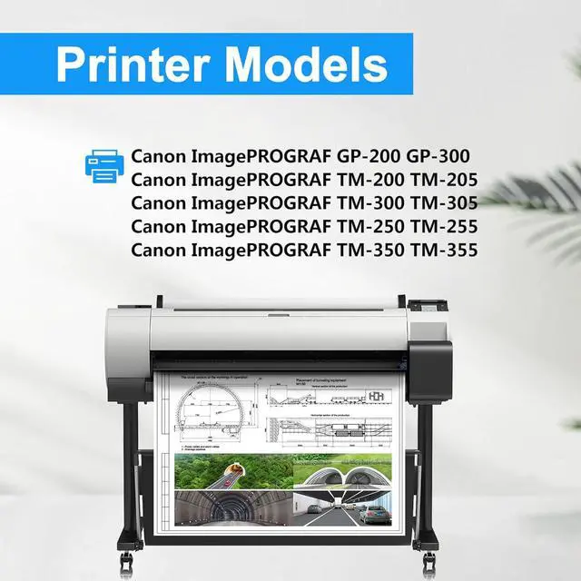 Compatible Printers: Replacement for Canon imagePROGRAF GP-200, GP-300,TM-200, TM-200 MFP L24ei, TM-205, TM-205 MFP L24ei, TM-300, TM-300 MFP L36ei, TM-300 MFP T36, TM-300 MFP T36 AiO, TM-305, TM-305 MFP L36ei, TM-305 MFP T36, TM-305 MFP T36 AiO series Large format printers. for Canon imagePROGRAF TM-250 TM-255 TM-350 TM-355 printers.