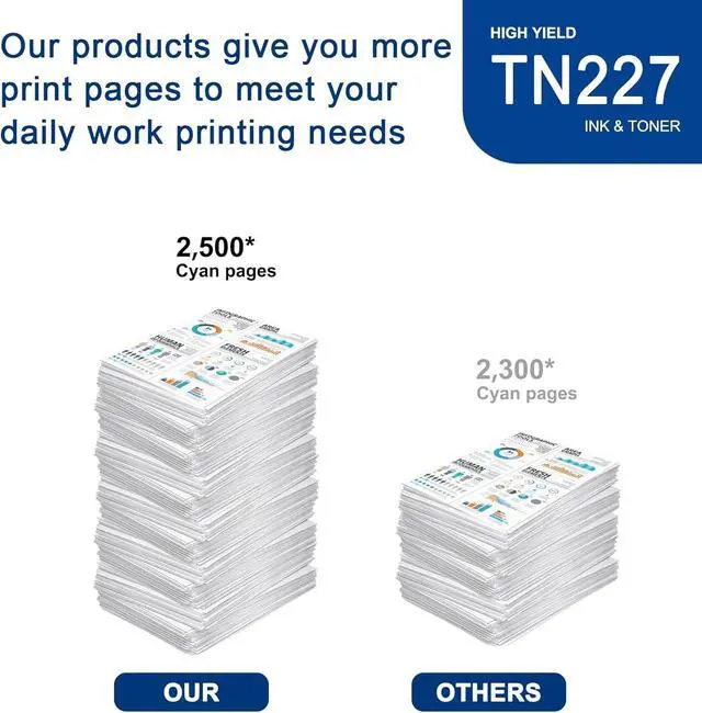 Page Yield: 2,500 pages per TN227 Cyan Toner Cartridge at 5% coverage (Letter/A4).