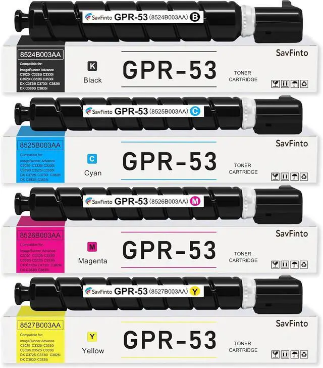 Package Contents : 1 x GPR-53 Black toner, 1 x GPR-53 Cyan toner, 1 x GPR-53 Magenta toner, 1 x GPR-53 Yellow toner (Total 4 Pack)