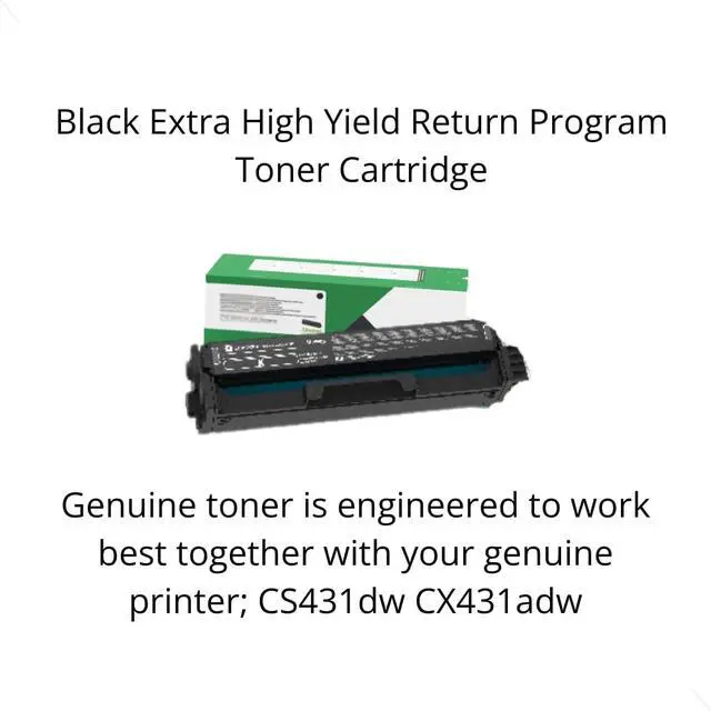 Here you have; The 20N1XK0 Black Extra High Yield Toner Cartridge which is engineered for high-quality printing, providing crisp text and a moderate to high page yield. It is suitable for offices requiring frequent document printing. This Return Program Toner features the toner's unique formulation that consistently delivers outstanding image quality, ensures long-life print system reliability and promotes superior sustainability - all in an innovative, shake-free print system. Genuine toner is engineered to work best together with your genuine printer; CS431dw CX431adw. Delivering excellent print quality from the first page to the last. Maximize your savings and enjoy premium quality with Genuine cartridges. Extra High Yield cartridges offer a lower cost per page and contain more pages than Standard Yield cartridges do. Perfect for high volume printing. Approximately Extra High Yield 6,000 pages. If you are looking for the best on the market, then this is the perfect choice for you. Keep up-front costs low and quality high with genuine cartridges.