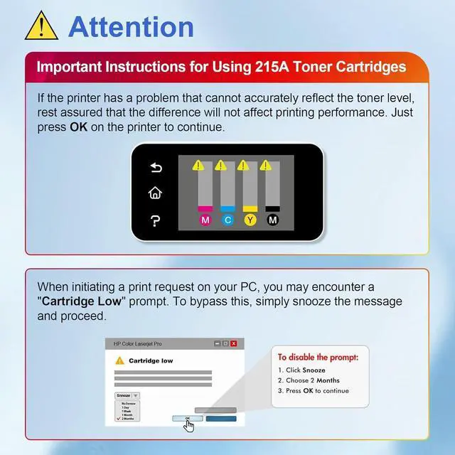 High Page Yield: Each 215A black toner prints up to 1,050 pages, and each color cartridge (C/M/Y) prints up to 850 pages at 5% coverage (A4). Enjoy consistent, long-lasting prints that exceed your expectations.