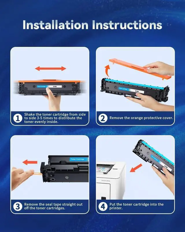 Package Included: 1 x 218X W2180X Black toner with chip, 1 x 218X W2180X Cyan toner with chip, 1 x 218X Magenta toner with chip, 1 x 218X Yellow toner with chip,1 x User Guide(Total 4 Pack)