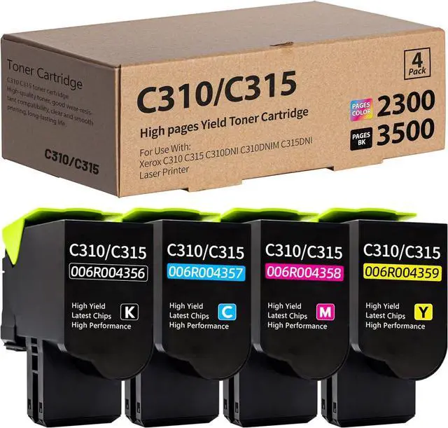 3.Content: 4 Pack Remanufactured Toner Cartridge for 1 pack Black toner cartridge (006R04356 c310 c315 toner), 1 pack Cyan toner cartridge(006R04357 c310 c315 toner) , 1 pack Magenta toner cartridge(006R04358 c310 c315 toner), 1 pack Yellow toner cartridge(006R04356 c310 c315 toner). ( total 4 pack)