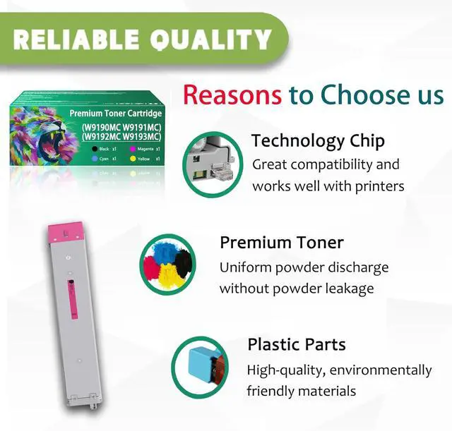 Our AdvantagesW9190MC W9191MC W9193MC W9192MC toner cartridge uses premium toner, with fine particles, low scrap rate, and no ink leakage, ensuring sufficient number of printed pages, high color saturation, and clearer color printing, creating a more realistic creation for you and your eyes visual effects.