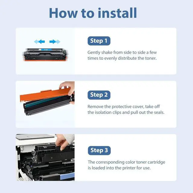 Easy to install your new replacement for hp 410X CF410X toner cartridge, just follow the instructions and get up and running in minutes. Tip: Avoid touching the green drum, as oil stains on your fingers may affect the print quality.