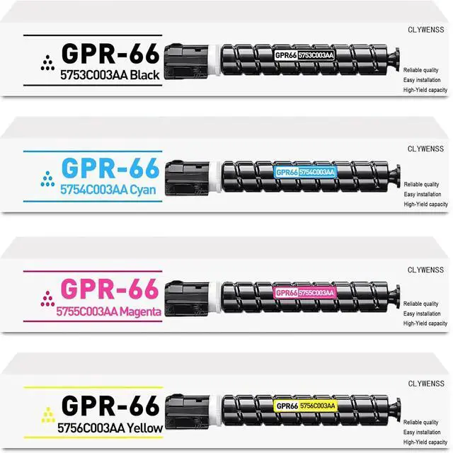 Package Content: 4-Pack of canon gpr-66 toner cartridge set. Including gpr-66 5753c003aa black 5754c003aa cyan, 5755c003aa magenta and 5756c003aa yellow toner cartridge