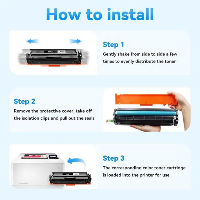 Reliable & Quality Assurance: Rigorously tested for reliability. Before purchasing, please verify compatibility with your printer model to ensure a perfect fit. Compatible for HP414A 414X toner cartridges 4 pack include 1 Pack 414A black toner W2020A, 1 Pack 414A cyan toner W2021A, 1 Pack 414A magenta toner W2023A, 1 Pack 414A yellow toner W2022A.installation