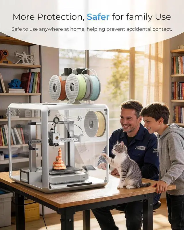 More Protection, Safer for family Use The fully enclosed, insulated structure provides complete protection, allowing you to place it anywhere in your home and effectively preventing accidental contact with children and pets during operation. It provides a stable and safe printing environment for your 3D printing needs.