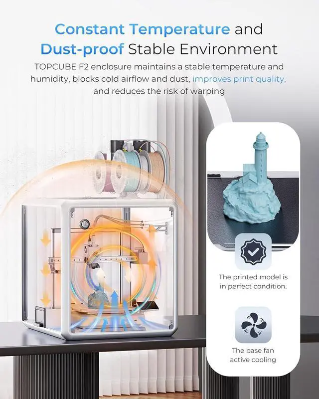 Improve Print Quality with Consistent Temperature TOPCUBE F2 acrylic enclosure creates a stable temperature and humidity environment, enhancing printing quality and minimizing the risk of warping and breakage. The base includes an active cooling system with a fan to actively dissipate heat from the printer, preventing the internal temperature from becoming too high while the heatbox is heating up.
