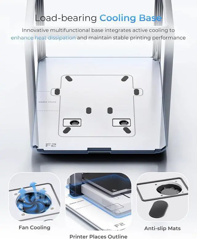 Load-bearing Cooling BaseThe first 3d printer enclosure with a multi-functional load-bearing base! Innovative multifunctional base integrates active cooling to enhancing heat dissipation from the printer's mainboard and maintain stable printing performance.
