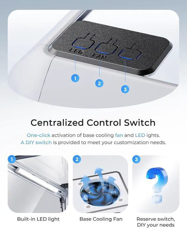 Centralized Control We've integrated the switches for the LEDs, base fan, and display screen into the top of the chassis. Simply press the switch to control these functions. An additional switch is also provided to support your personalized DIY needs.