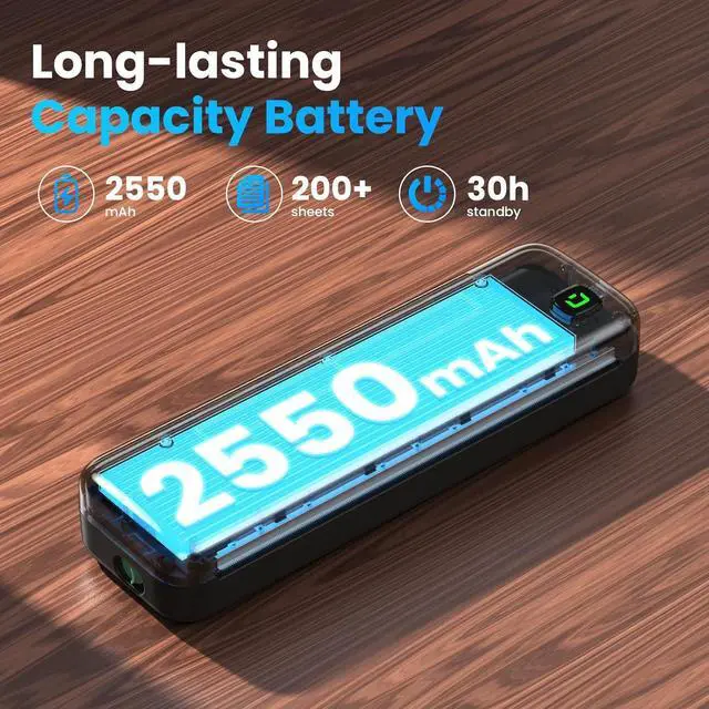 [Powerful 2550mAh Battery & Auto Power-Saving] This CyberPixel Bluetooth thermal Printer could print up to 300 pages per charge (varies by usage) with the built-in 2550mAh long-lasting battery. Features auto sleep mode to conserve energy, ensuring reliability for office, outdoors, homes, or all-day work.