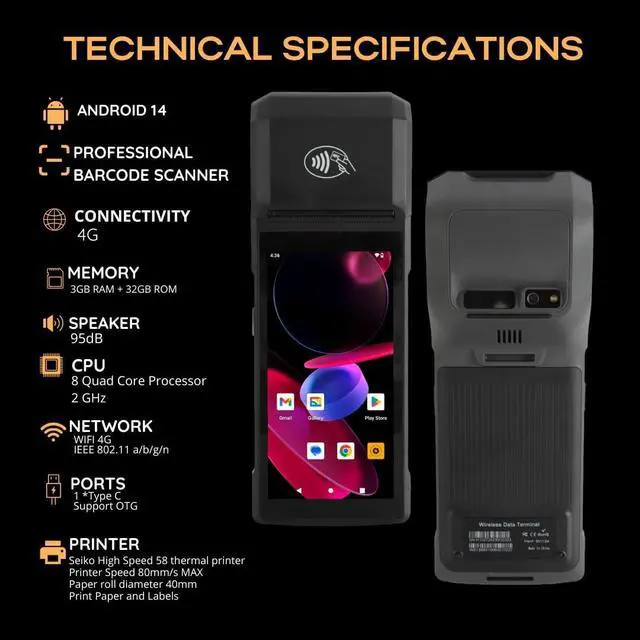 Integrated High-Speed Receipt Printer: Features a built-in 58mm Thermal Printer with a rapid 80mm/s speed, providing a true All-in-One Mobile Solution for quick and efficient receipt issuance on the go.
