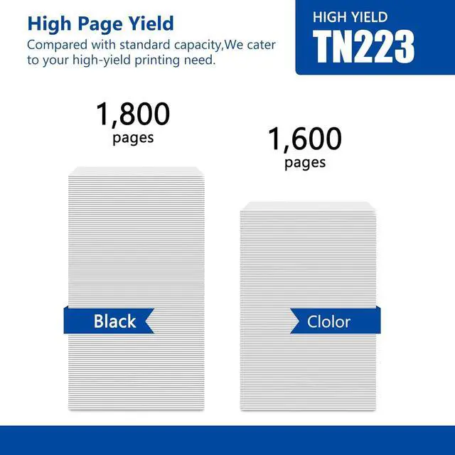 Page Yield: 1,800 pages per TN223 TN-223 black toner cartridge at 5% coverage; 1,600 pages per TN223 TN-223 color toner cartridge