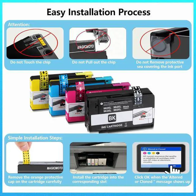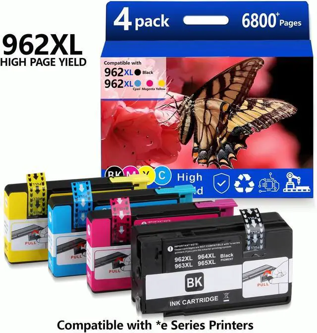Package Included: 1 x Black 962xl ink cartridge, 1 x Cyan 962xl ink cartridge, 1 x Magenta 962xl ink cartridge, 1 x Yellow 962xl ink cartridge,Total 4 pack for hp 962 962xl ink Cartridges Combo Pack. Important: Expect a 4-minute recognition period during the first install of this replacement for HP 962XL printer ink cartridges. When the "Altered or Cloned" message appears, click OK to proceed printing on your HP 9015 printer or other models listed above