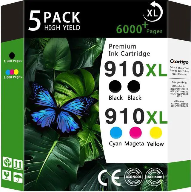 Package Contents: 5 Pack 910XL Ink Cartridges, 2 x Large Black 910XL Ink, 1 x Cyan 910XL Ink, 1 x Magenta 910XL Ink, 1 x Yellow 910XL Ink (Non-OEM)