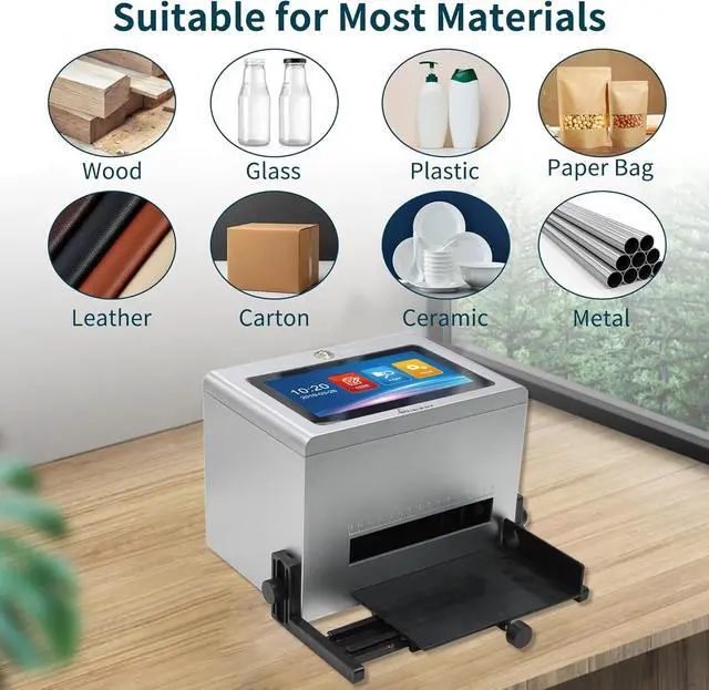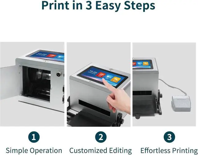 Three Printing MethodsPhezer inkjet coding machine provides three printing modes: foot pedal, hand press, photoelectric sensor model (need to buy separately) for fast printing. The position positioning plate is adjustable for precise printing. Printing Height: 0.08inch(2mm)-0.5inch(12.7mm)the number of printing lines is adjustable, each printing length: 1-6.5cm.