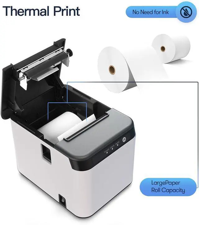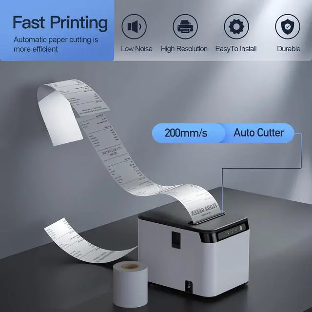 Efficient & Affordable Printing: Our 80 receipt printer is designed for high efficiency, with a fast printing speed of up to 200mm/sec. It features an auto cutter for easy paper cutting and requires no ink cartridges or ribbons, resulting in low operation costs. Additionally, the thermal print head ensures clear printing, and thermal paper is readily available.