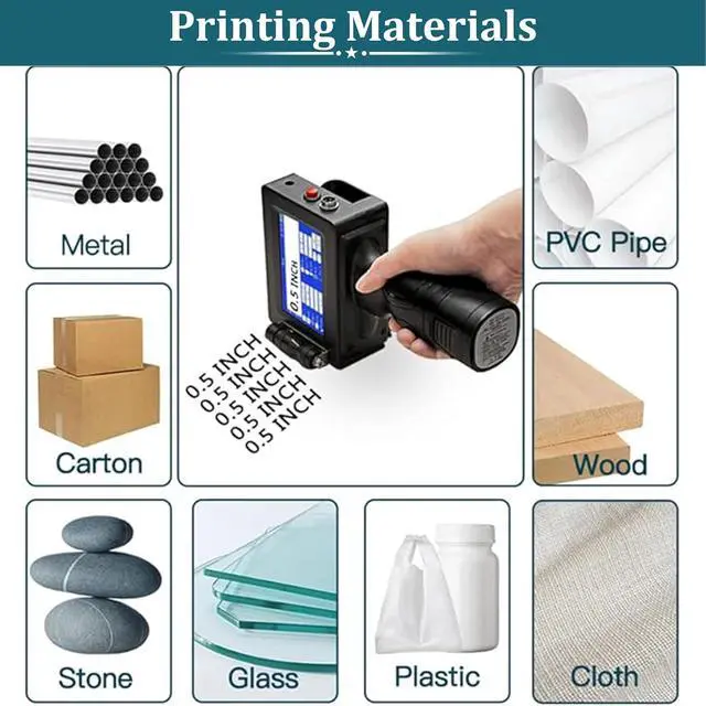 [8+ Printing Contents and 10+ Printing Surface Allowed]: This inkjet printer equipped a Responsive 4.3inch LCD capacitive touch screen (supports font, size and style editing directly) is suitable for printing text, label, digital, QR code, barcode, production date, time, logos on the surface of paper, boards, carton, stone, pipe, cable, metal, glass, plastic, cloth etc directly. 25 Languages available and 360 degree all-round printing supported along with the included positioning plates.