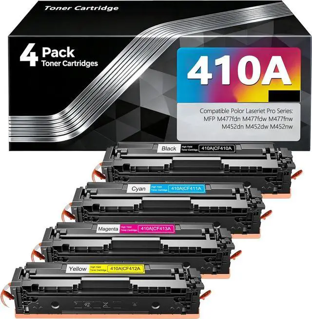 Package Contents: 1 x 410A CF410A black toner, 1 x 410A CF411A cyan toner, 1 x 410A CF412A yellow toner, 1 x 410A CF413A magenta toner (Total 4 Pack)