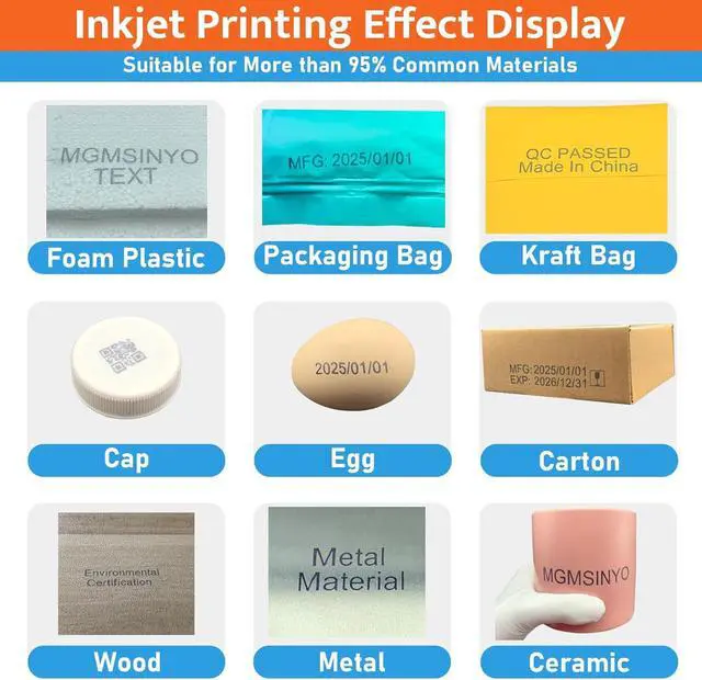 Printing SurfaceSupport more than 95% of the printing surface. Such as wood / glass / plastic bottles / metal / paper boxes / pearl cotton / kraft paper / pipe / aluminum foil / cable / wire / concrete / fabrics / clothes / plastic bags etc.