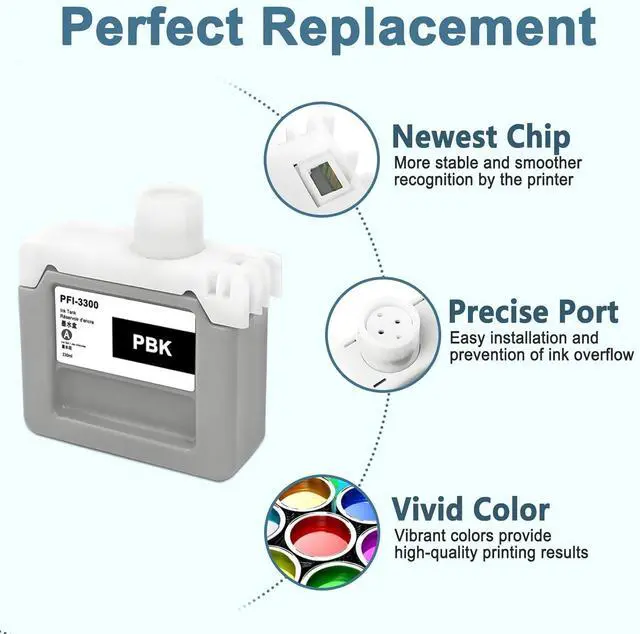 Superior Quality: This high-yield PFI-3300 ink cartridge uses the latest chip technology and high-quality pigment ink, with an anti clogging nozzle design and easy installation. Provide clear text and graphics