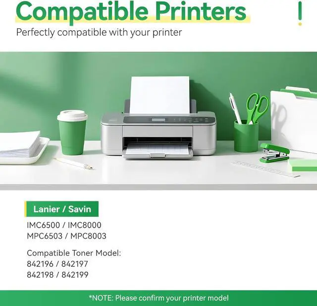 Compatible Printers: Compatible with Ricoh Lanier Savin IMC6500, IMC8000, MPC6503, MPC8003 Printer. Compatible Toner Model842196, 842197, 842198, 842199.