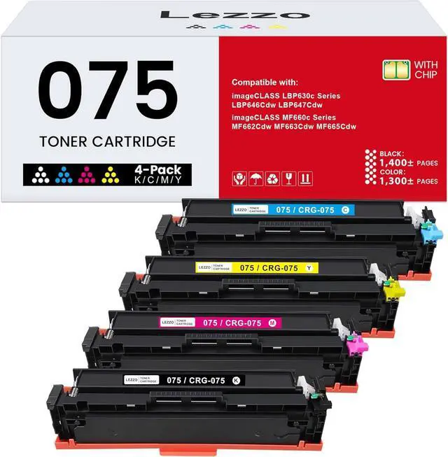 Products in the package: 4 Pack 075 CRG-075 Toner Cartridge, 1x 075 Black toner, 1x 075 Cyan toner, 1x 075 Magenta toner, 1x 075 Yellow toner